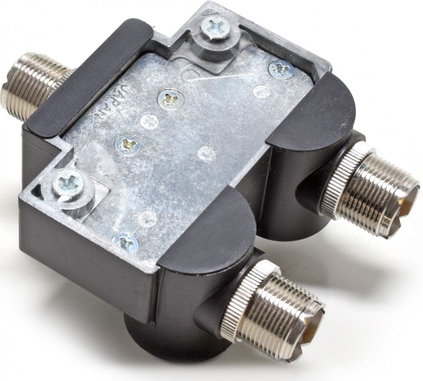 Mechanischer 2fach-Umschalter mit PL-Buchsen zum Betrieb von zwei Funkgeräten an einer Antenne (oder zwei Antennen an einem Funkgerät).