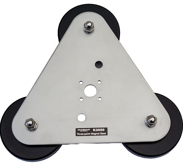 3-fach Magnetfuss Diamond K-3000. Mit drei kräftigen Magneten mit je 85mm Durchmesser, ohne Koaxbuchse, ohne Kabel. Zur Installation der Diamond Kabelsätze oder einer Eigenkonstruktion mit PL- oder N-Buchse. Das zentrale Loch hat 16mm Durchmesser, die 4 Schraublöcher um die zentrale Befestigung einen Abstand von 23x23mm. Gewicht ca. 1.5 kg.
