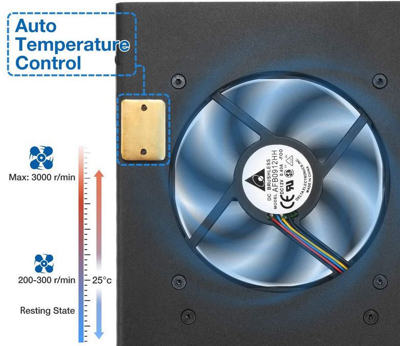 - Wenn der Sensor feststellt, dass die Gehäusetemperatur über 60 C liegt, erhöht der Lüfter automatisch die Drehzahl, und somit das Luftzufuhrvolumen welches den Kühlprozess beschleunigt.